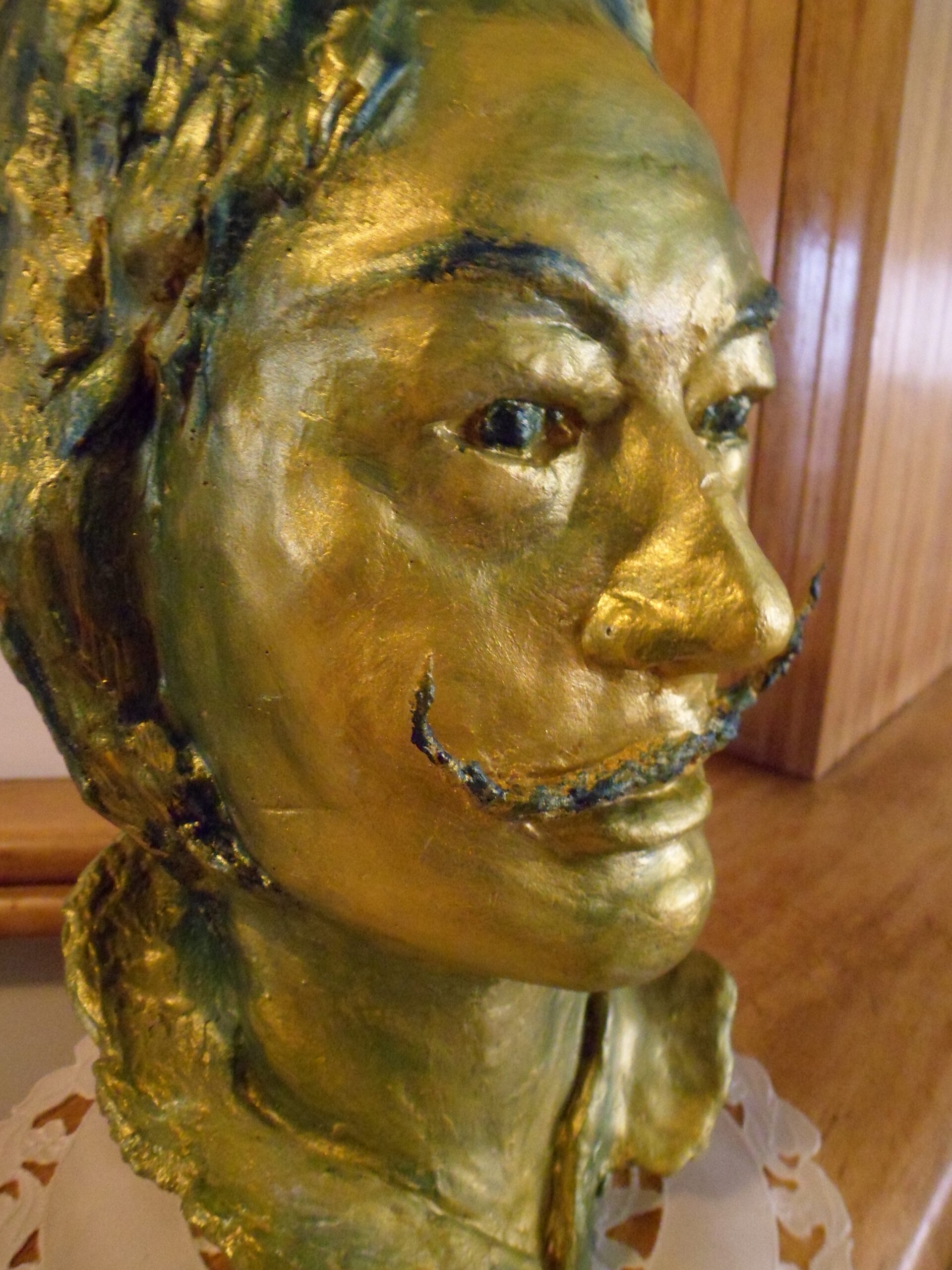Al creador y excentrico surrealista Dali, hecho en cemento y acrilico dorado y verdes y patinas .