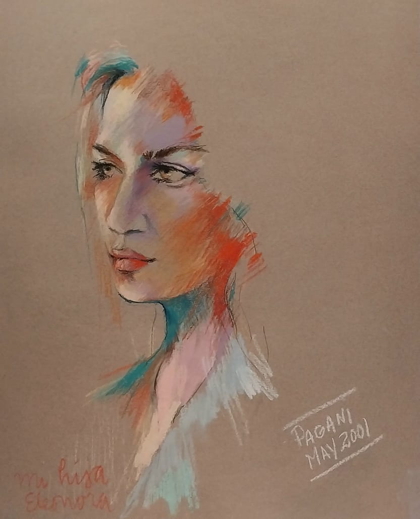 Eleonora mi hija, dibujada con pasteles, utilizando una tecnica con rayas pequeñas y todos los colores, y me parecio muy femenino.