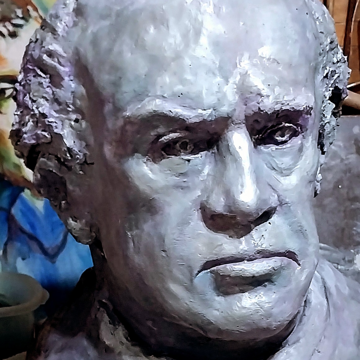 Obra en cemento y luego patinas, tratando de mostrar la fuerza y pasion de este extraordinario argentino.