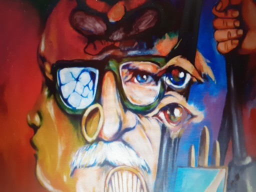 en esta pintura, una de las mas queridas por mi, es la admiracion, coraje , que trate de sintentizar aspectos de su obra.